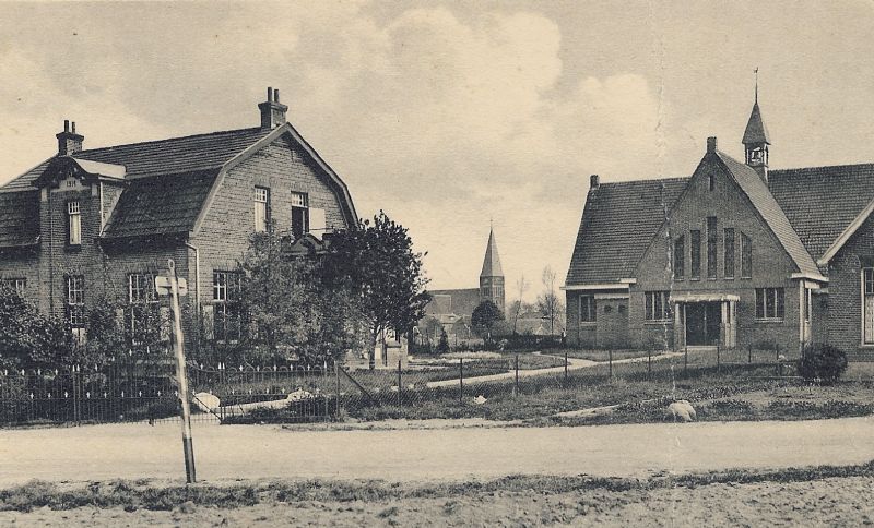 De Gereformeerde kerk aan de Rijssenseweg met de pastorie omstreeks 1950. (Ansichtkaart).
