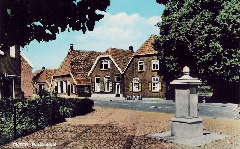 De Hogebrink met de oude pomp op een van de eerste kleuren-ansichtkaarten van Enter. (Ansichtkaart).